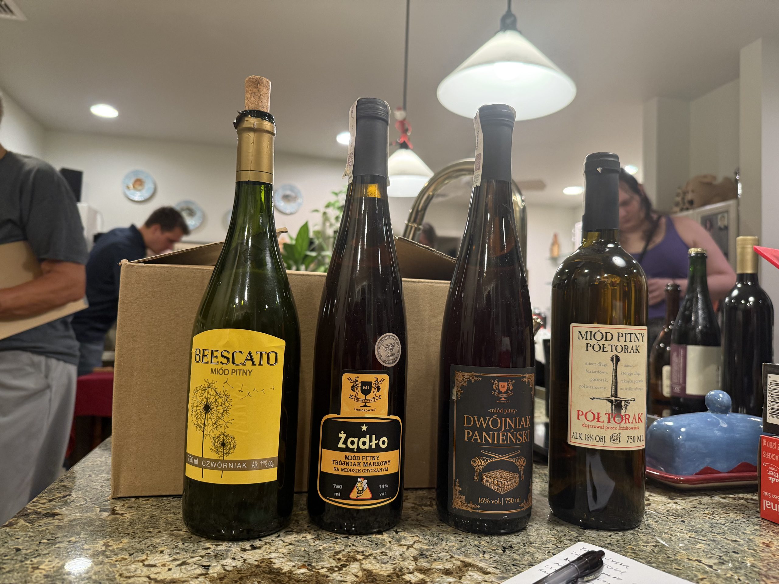 Paul was gracious enough to share 4 different Polish meads with the club that he had shipped back from Poland on his recent trip overseas. His presentation is available on our Discord channel – it’s well worth checking out! Meads are certainly not in my wheelhouse, and I learned a ton during his presentation. Polish meads are a distinct style, where honey is always the most prominent flavor – any fruit or spices will have a light touch. The residual sugar content is balanced by alcohol, rather than acid or tannins, and oxidation is common (and welcome!) in sweeter styles. We tried one of each of the different strengths – with my personal favorite being the Dwójniak.