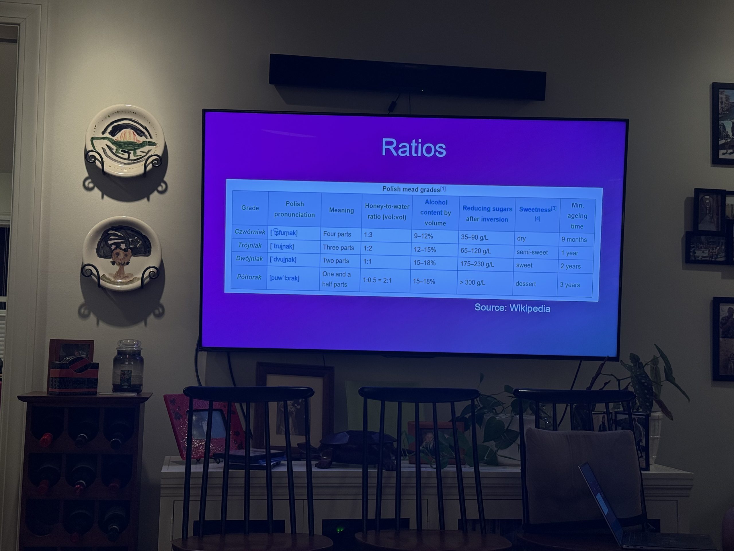 Following a few pours of mead and the excellent presentation, we continued on to our traditional tasting portion of the evening. Notes are below. Again, a huge thanks to Paul and Kathi for hosting and sharing their home and meads!